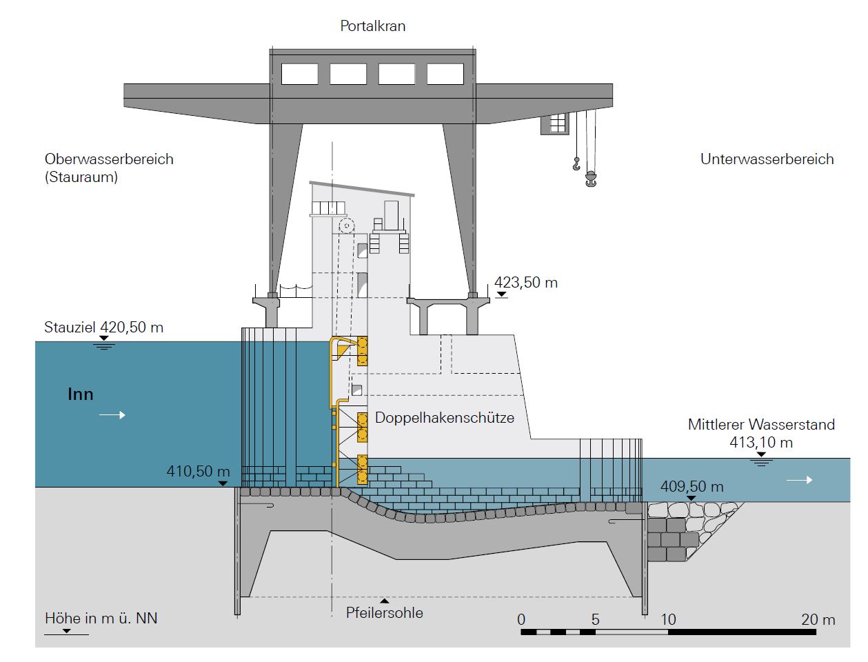 Das von 1935 bis 1938 von der Innwerk AG errichtete Kraftwerk Teufelsbruck stellt gemeinsam mit den gleichzeitig errichteten Stufen Wasserburg und Gars die erstmalige Verwendung des Buchtenkraftwerktyps am Inn dar. Im linksufrig an der Innenseite der Flussschleife situierten Krafthaus sind 5 Maschinensätze bestehend aus je 1 vertikalen Kaplan-Turbine und je 1 Drehstromgenerator eingebaut. Die 4 Wehrfelder sind 10 m hoch und 16 m breit.