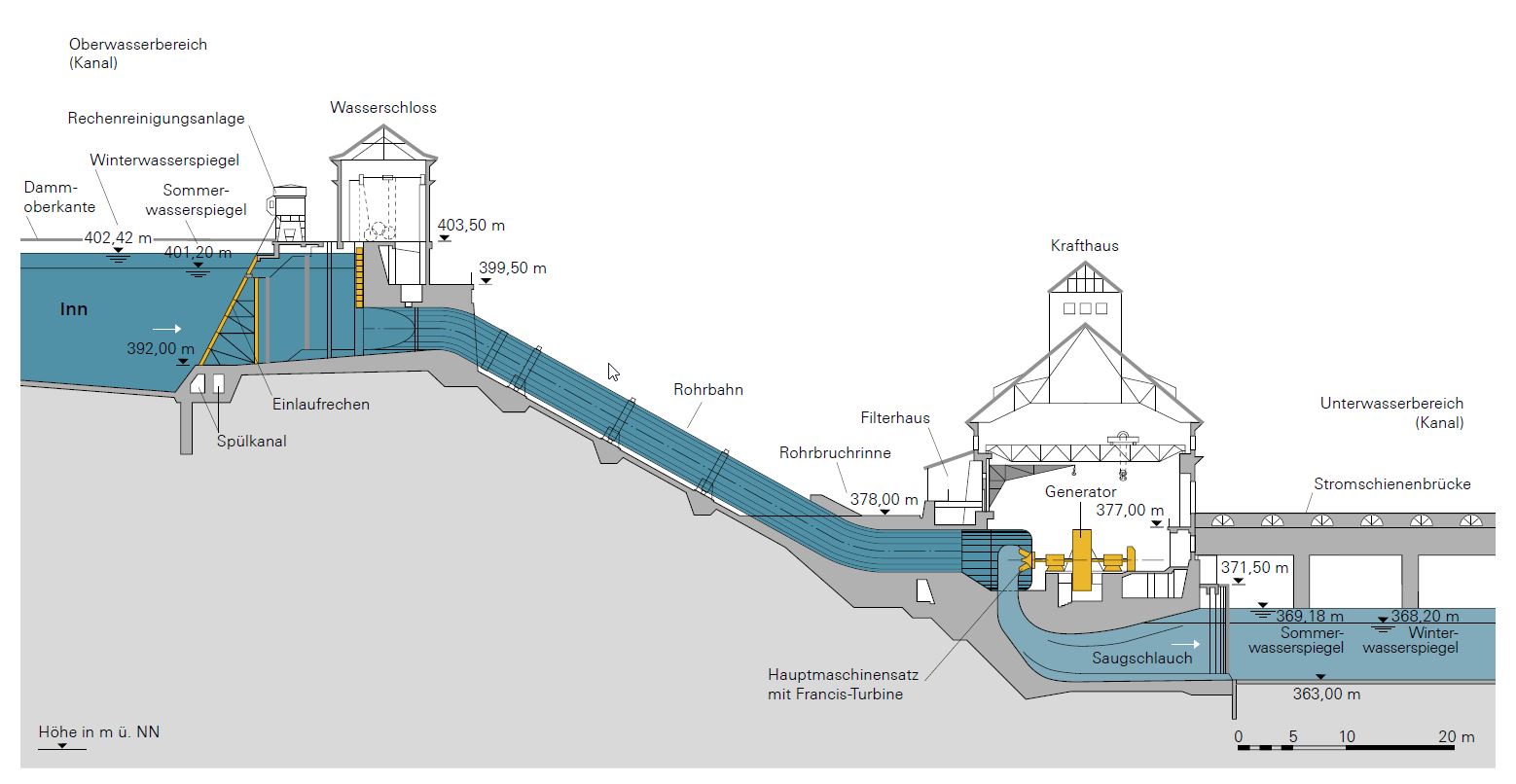 Das seinerzeit größte Kanalkraftwerk Mitteleuropas nimmt auch heute noch eine bedeutende Stellung in der Stromversorgung der elektrochemischen Industrie Südostbayerns ein. Auch die maschinelle Einrichtung des Kraftwerkes besaß für damalige Verhältnisse außergewöhnliche Größenordnungen. Die Maschinensätze bestehen aus Francis-Stirnkesselturbinen mit waagrechter Welle, die für den Antrieb der 8 Drehstromgeneratoren und 7 Gleichstromgeneratoren konzipiert waren.