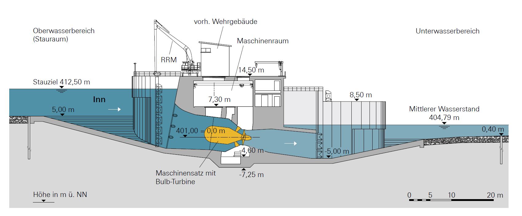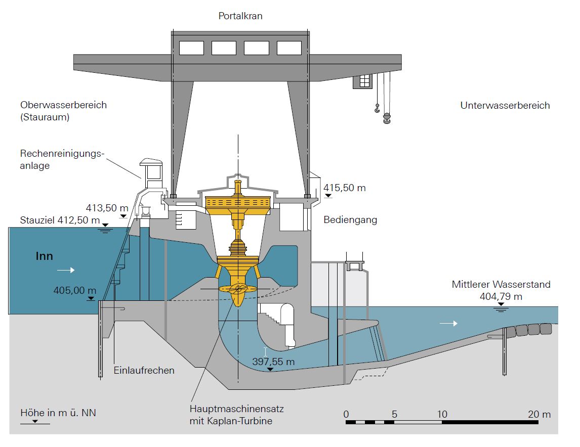 Das Wehr liegt an der Außenseite der Flusskrümmung. Im Krafthaus am linken Innufer sind 5 Maschinensätze bestehend aus je 1 Kaplan-Turbine und je 1 Drehstromgenerator eingebaut. Die ökologische Durchgängigkeit ist ab 2014 durch ein Umgehungsgerinne mit vielfältigen ökologischen Funktionen gewährleistet.